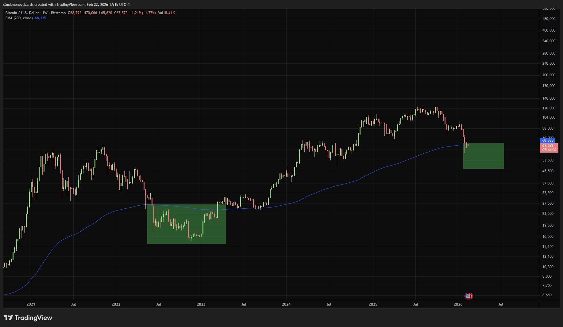 BTC remains inside a key historical accumulation area near the weekly EMA200.