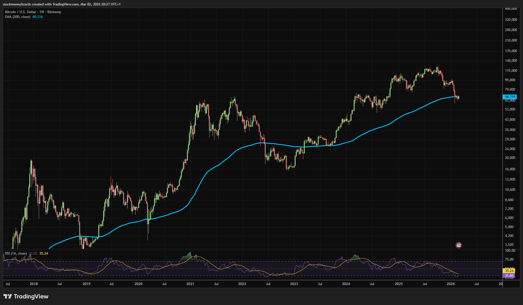 Still below the weekly EMA200.