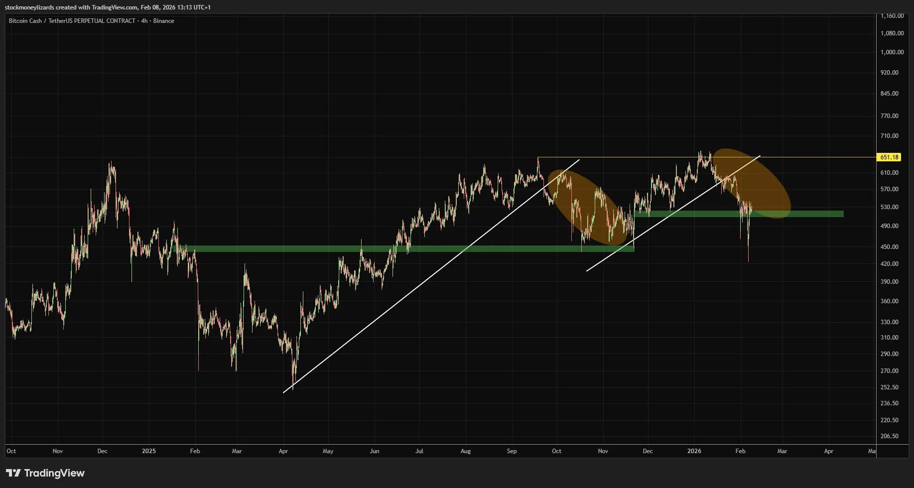 Bitcoin Cash (BCH): Liquidity target swept; now back inside a higher-timeframe support zone. Dips into this area are of interest, assuming BTC stabilizes.