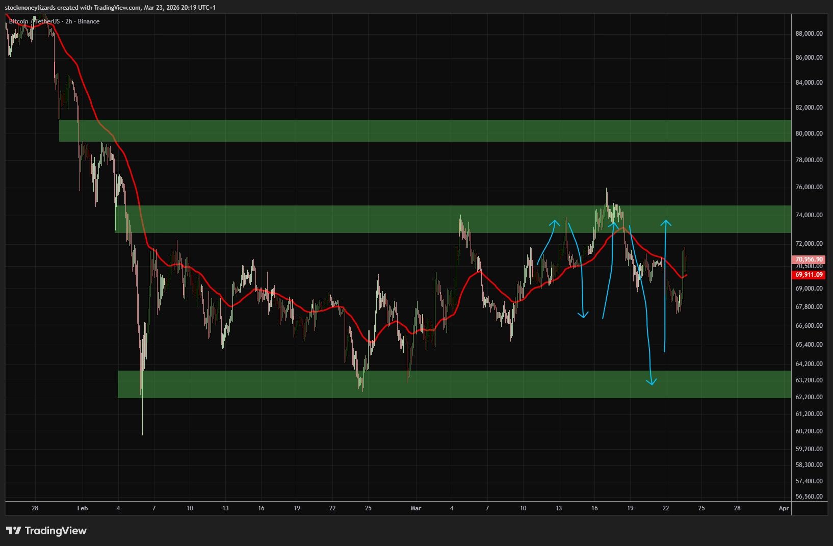 BTC bounced from the lower range and is now trading back into the same supply zone around 70k–74k.